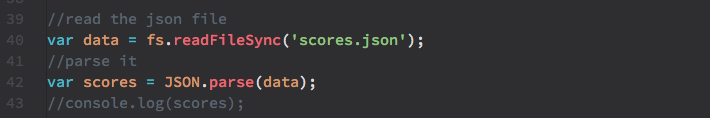 Save this file, and in server.js, add some lines to load and read this file and store its contents in the variable scores when the server starts.