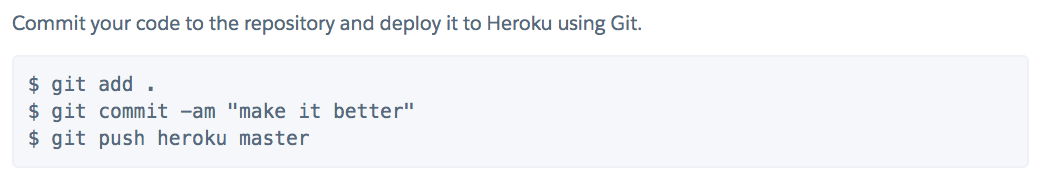 The commands tell the app to git add ., or "add everything to our Git version in this folder", git commit -am "your message here" to initialize a "commit" of this change, and git push heroku master to "push" that change to the master "branch" of your application on Heroku. You should get back a bunch of information from Heroku, and at the end of all this, a web address where your APP is now residing:
