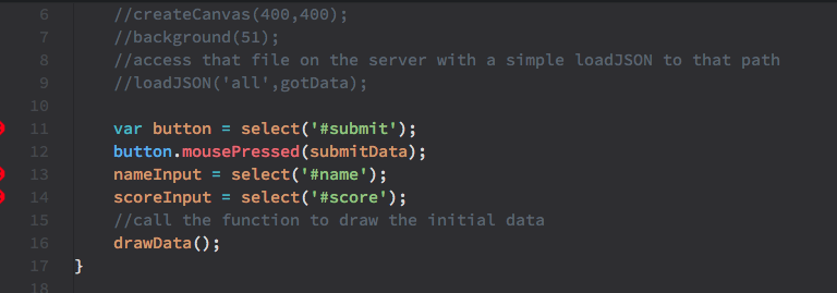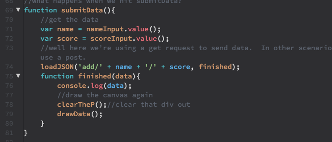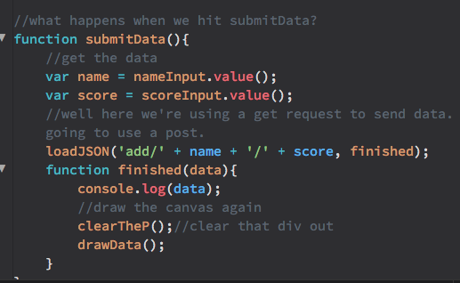When the submit button is pressed, the submitData() function is called which grabs the values in the input fields, and runs a "GET request" with the p5.js function loadJSON() . Writing what happens when these get requests are called will happen on the server side, but for now just note that the important part happens with the parameters entered into loadJSON() , which structure a url extension with the name and score entered by the website user in the input fields. When this function is finished a callback is called that runs two other functions, clearTheP(), which removes the previous scores div from the page, and drawData(), which pulls all of the data from the server and displays it on the page.