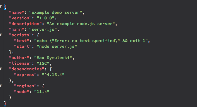 In your text editor open package.json once again and addthis information with a new key called "engines". Your finished package.json file should look like this: