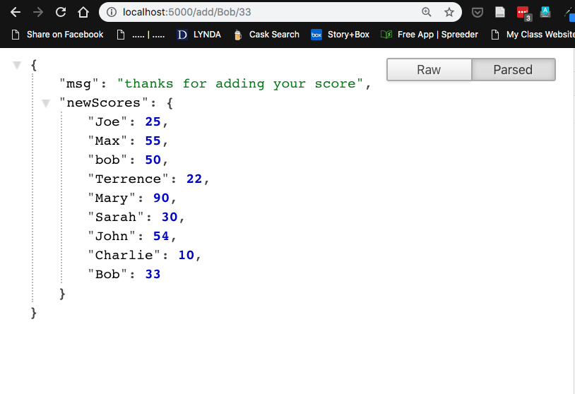 This assigns the path to /all to a function that returns the scores object which should be persistently updated to reflect any new scores. Again, stop your server, start it again, and check the new path by going to http://localhost:5000/all. You should get a response in the browser with the entire scores object.