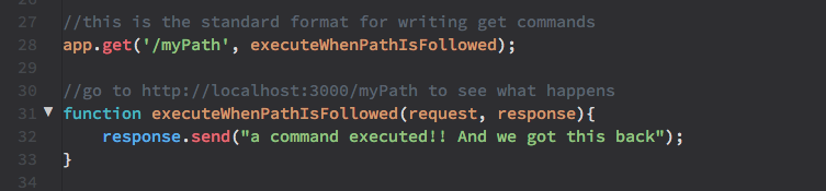 Take a look again at the server code in server.js. app.get(); has two parameters: 1) the path to follow, in this case "/myPath", and 2) the callback function, in this case function executeWhenPathIsFollowed(), which has a purposefully convoluted name to make a point. This is your first server path. As long as this line is in your code, anytime someone navigates to /myPath from your server root, they'll get a short text response displayed in the browser.