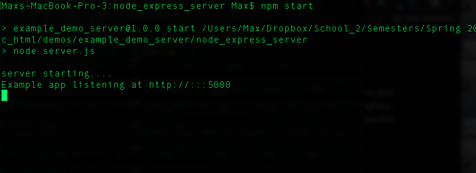 Heroku will now know how to start your server. You can also test this command to make sure it is working locally by navigating to the Terminal and starting your server with: